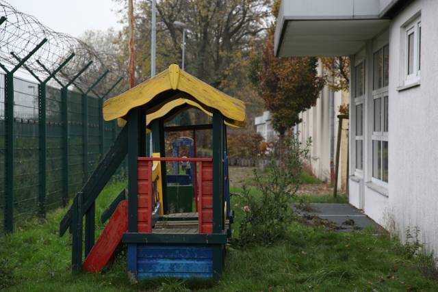 Spielgerät zwischen Stacheldraht und Kindergarten