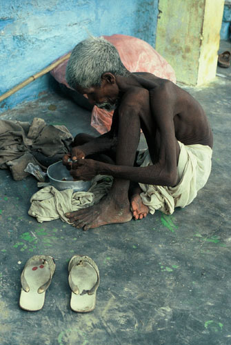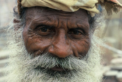 "Wenn Du die Grenzen Kashis (Varanasi) erreicht hast, dann nimm einen Stein und zertrümmere Deine Füße, damit Du die Stadt nie wieder verlassen kannst." Dieser alte Mann ist an den Ganges mit seinen letzten Habseligkeiten gekommen, um zu sterben. Indien 2004