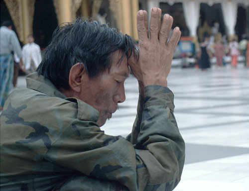 Ein Betender in der Schwedagonpagode in Rangoon. Birma 2001