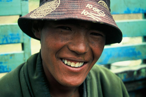 Loddan, Mönch aus Kham/Osttibet auf der Ladefläche eines chinesischen Trucks der Marke "Dong Fang/ "Ostwind" auf der beschwerlichen einwöchigem Pilgerreise in die heilige Stadt Lhasa. Tibet 2002