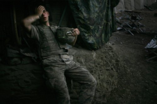American soldier resting at bunker, Korengal Valley, Afghanistan, 16 September
