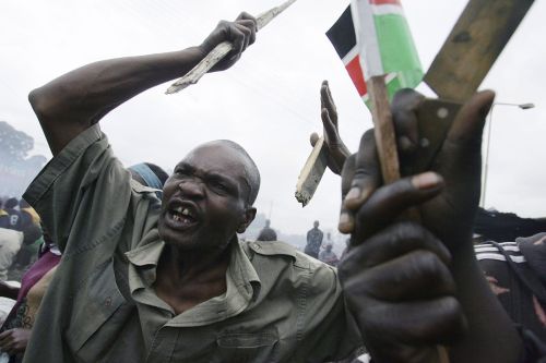 A supporter of defeated candidate Raila Odinga waves a stick during protests in Kibera, an opposition stronghold. Unrest swept through Kenya after people disputed current leader Mwai Kibaki's narrow victory in presidential elections.