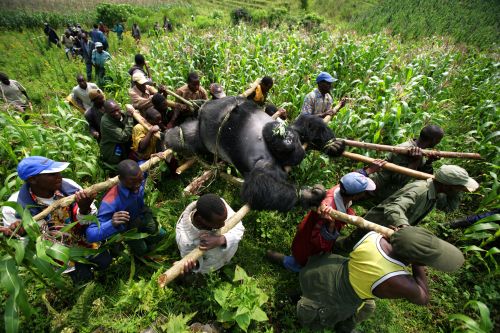 Evacuation of dead mountain gorillas, Virunga National Park, Eastern Congo