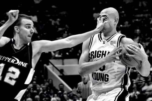 Chris Detrick, USA, The Salt Lake Tribune Sports portfolio: Pepperdine's Jason Walberg gouges the eyes of Brigham Young University's Jonathan Tavernari during a basketball match in Provo, Utah, USA. No foul was called. Although Tavernari missed the basket immediately after the incident, he was not injured. Later in the game he scored back-to-back three-pointers, helping his team win 86-67.