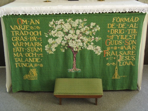 Gestickter Text auf der Altardecke der Kirche von Pelarne, Schweden