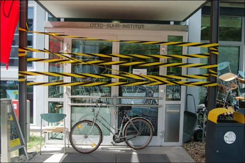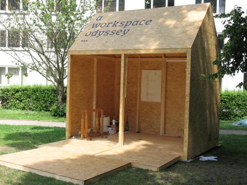 Architekten der Bauhaus-Uni in Weimar üben mit ihrem "workspace" Kritik: Mit der Errichtung des provisorischen Arbeitsraumes direkt vor dem Henry van de Felde-Gebäude möchten sie auf die schlechten Studienbedingungen ihrer Fakultät hinweisen bzw. protestieren, dass es zu wenige und schlecht ausgestattete Räume gibt. Foto: Christoph B.