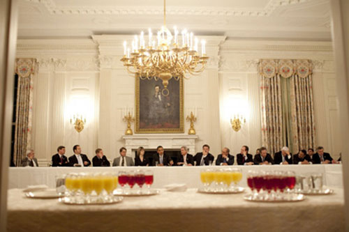 Feb. 10, 2009 "The President meets with the Democratic Blue Dog coalition in the State Dining Room. I had noticed the glasses of cranberry and orange juice sitting on a table in the doorway of the Red Room, so I backtracked to compose this picture from inside the Red Room."