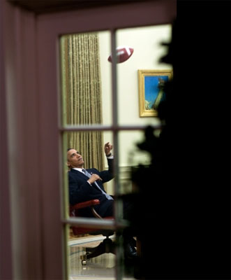 April 23, 2009 "The President throws a football to one of his aides before a meeting in the Oval Office."