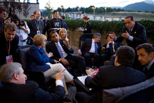 July 8, 2009 "This was a great scene just before dinner at the G-8 Summit in L'Aquila, Italy. As the leaders arrived, they spontaneously moved to a small patio outside. Several different conversations were taking place. Finally as dusk settled in, Italian Prime Minister Silvio Berlusconi, at far right, motioned for everyone to move inside for the dinner."