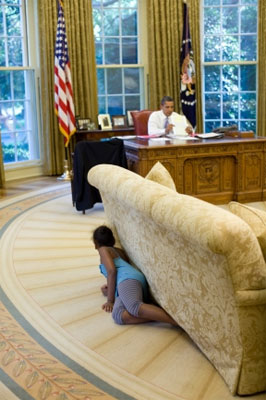 Aug. 5, 2009 "I was sitting in the reception area outside the Oval Office when Sasha walked by and headed to the Oval. I suspected something was up, so I followed her. Sasha then crawled into the office, hiding behind the sofa, and when she reached the far end, jumped up and yelled trying spook her dad."