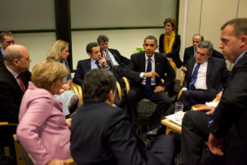Dec. 18, 2009 "The President briefs European leaders following a multilateral meeting in which an agreement was tentatively reached at the United Nationals Climate Change Conference in Copenhagen, Denmark. Most conferences like this are very scripted; this one was just the opposite."