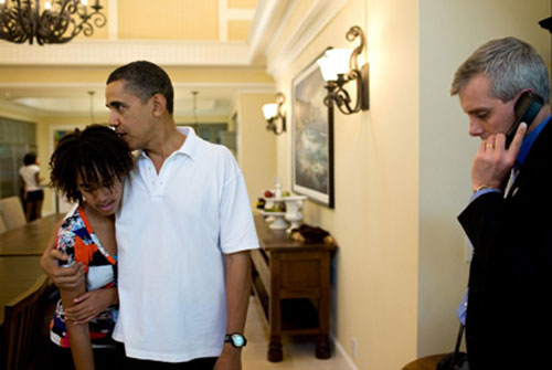 Dec. 29, 2009 "I thought this was an interesting juxtaposition between his role as a father, and his role as Commander in Chief. On vacation in Hawaii, here he is hugging his daughter Malia while NSC chief of staff Denis McDonough waits to connect him on the latest conference call following the attempted Christmas Day terrorist attack."