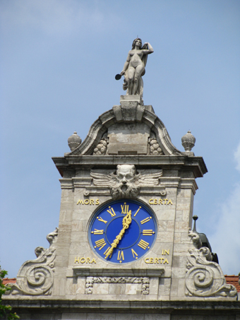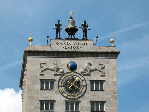 Die uhrzeitliche Dimension Hinweise, wie die Zeit vergeht, sind allgegenwärtig. Von Barbara Hempel (06.07.2011) ![]() Neben der Uhrzeit kann man am Kroch-Hochhaus in Leipzig auch die Mondphasen ablesen. Die Glockenmänner sind alle 15 Minuten und zur vollen Stunde nicht zu überhören. Die Inschrift: OMNIA VINCIT LABOR bedeutet ARBEIT ÜBERWINDET ALLES, in Italien findet man die Variante OMNIA VINCIT AMOR, da überwindet die Liebe alles. ![]() Am Neuen Rathaus in Leipzig steht der Satz: MORS CERTA HORA INCERTA, was man übersetzen kann mit: Der Tod ist sicher, die Stunde ungewiss. Da zu DDR-Zeiten die Uhr häufig defekt war, übersetzte der Volksmund: