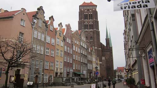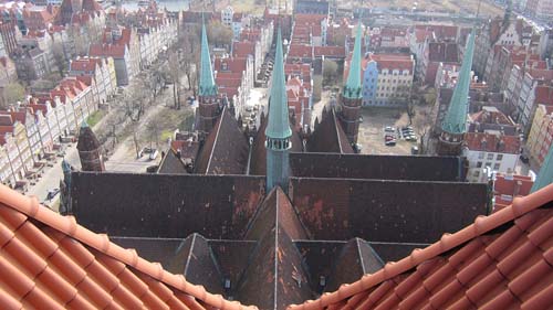 Blick auf die Marienkirche. Der mächtige Prachtbau der Danziger Patrizier wurde im Zweiten Weltkrieg stark beschädigt - bis hin zur Dachkonstruktion und Glockenaufhängung sind Beton und Stahl das vorrangig verwendete Rekonstruktionsmaterial.