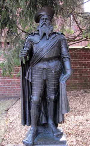 Albrecht von Hohenzollern, der letzte Hochmeister des Deutschen Ordens, in der Darstellung von Rudolf Siemering (19. Jh.). Die Statue gehörte einst zu einem Standbild König Friedrichs des Großen von Preußen im Vorfeld der Burg.