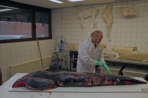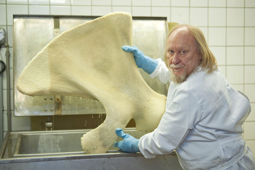 Werner Beckmann, Präparator am Naturkundemuseum in Münster, hat den Walpenis vor sich ausgestreckt liegen. (Foto: iley.de)