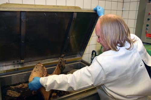 Präparator Beckmann öffnet die Mazerationsanlage und fischt das Schulterblatt des Wals aus einer braunen Soße. (Foto: iley.de)
