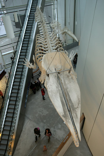 Bis dahin ist es für den Meeresriesen und seinen Präparator noch ein langer Weg: Das Skelett eines Pottwals hängt im Ozeaneum in Stralsund. (Foto: iley.de)